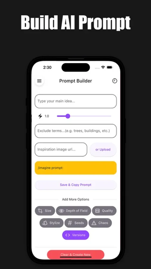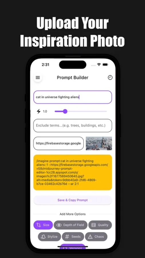 You can use text prompt and/or upload an inspiration image to build your prompt easy and fast.