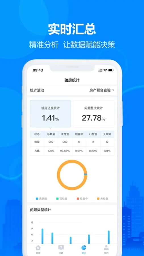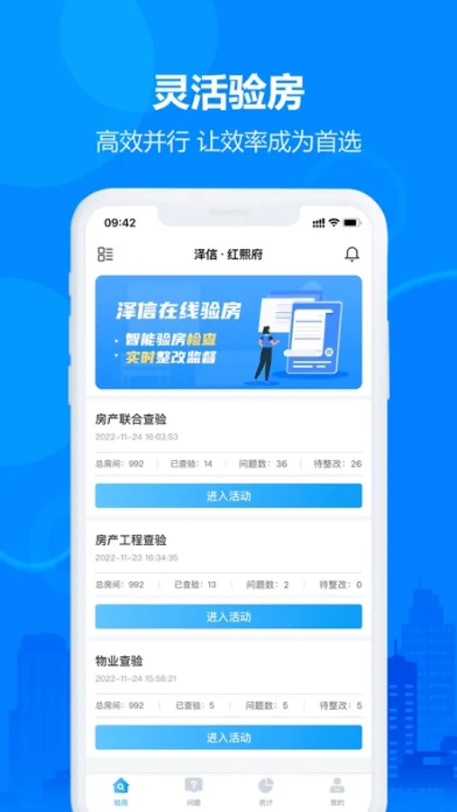 泽交付是提供给开发商、施工单位、监理单位使用的一套满足房屋内部查验、工地开放场景中使用的应用软件。通过该软件可实现房屋问题在查验、整改、复验、确认、关闭的不同阶段流转到对应的干系人系统内,实现问题的快速处理,高效整改。同时实现对参与人员的工作量、问题易发点等关键数据提供多样化的报表统计。