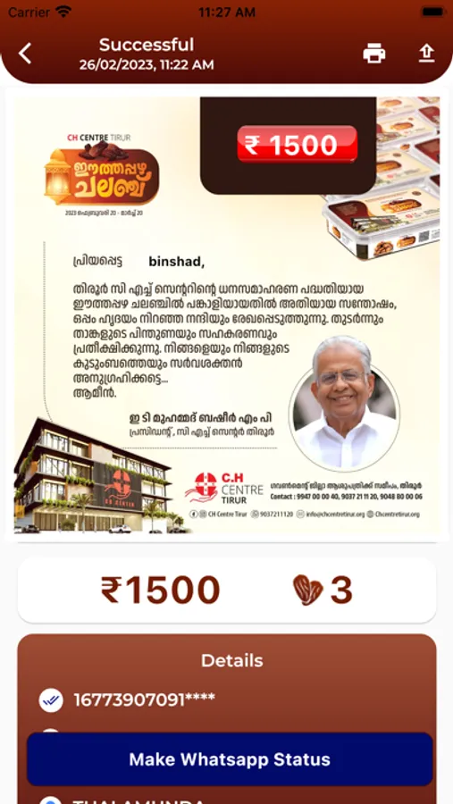 This application is from Ch Center Tirur, where you can order date packets, each with a price of 500, in the iOS application. As of now, you can't make a new order, but you can see who the people who ordered are and you can get your receipt.