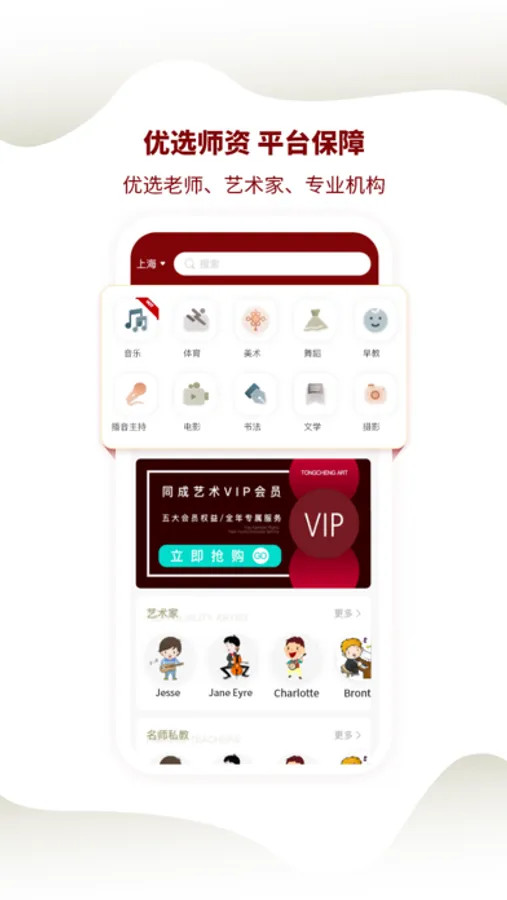 同成艺术是一家在线艺术类信息平台,通过O2O模式,通过手机App将本地优质艺术机构、优质师资及专家深度对接。在信息、交易、履约等方面给用户提供全面服务。让用户快而便捷的找到身边优质的艺术类机构、优秀的教师和专家。享受全面的信息,优惠的价格。联合国内外名师及大量专业院校老师,提供在线优选课程,名师在线测评、语音沟通及线下约课等全方面应用服务。致力于打造全面权威的艺术类信息平台。