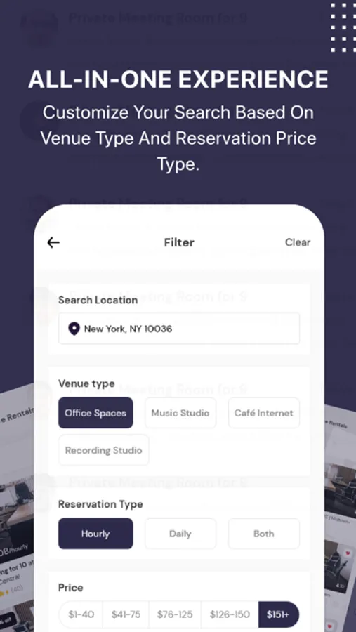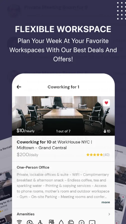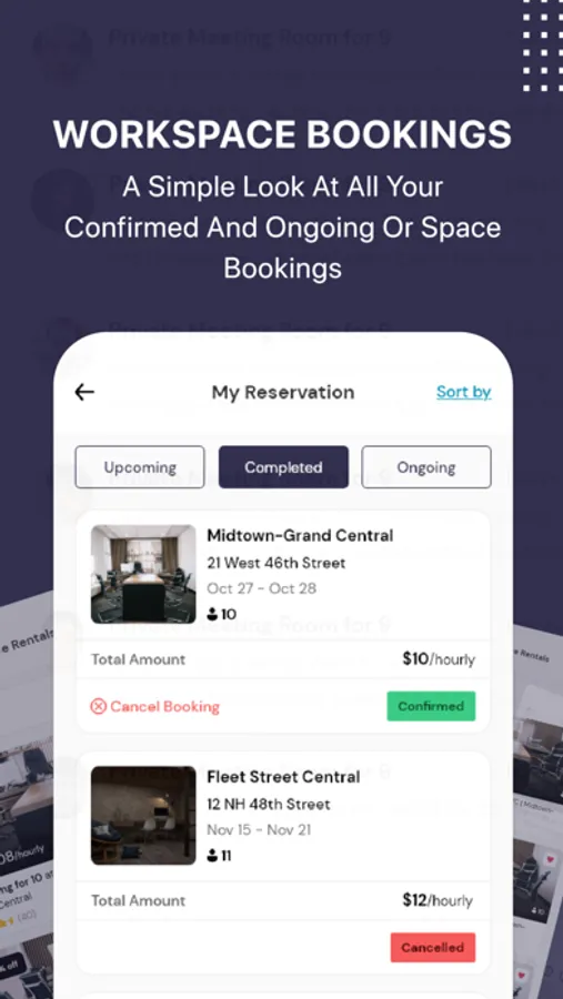 With the flexibility to choose the booking slots (Hourly / Custom), you may browse and reserve available places you like.
