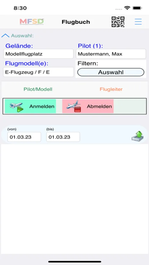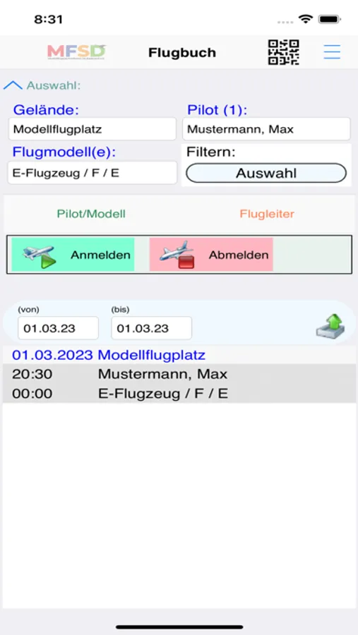 Die App eignet sich als zentrales Flugbuch auf deinem Gelände. Auf Laptop oder Tablet können sich die Piloten zum Flugbetrieb an- und abmelden und die Art des Modellfluges wie beim herkömmlichen Flugbuch eingeben.