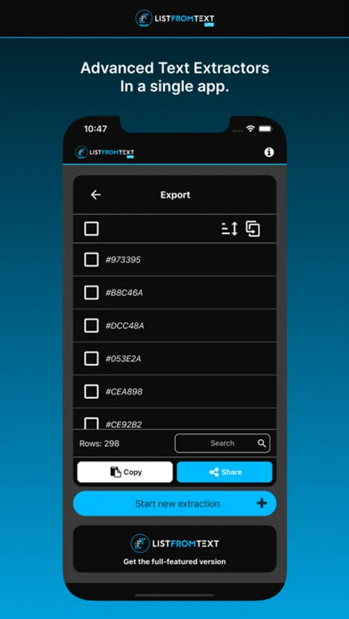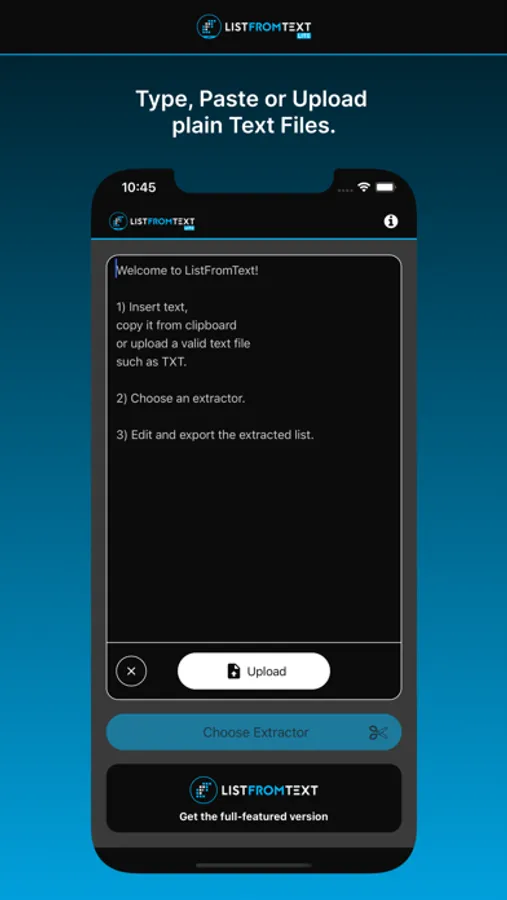 For more file upload formats and more extractors, get the full-featured ListFromText app.