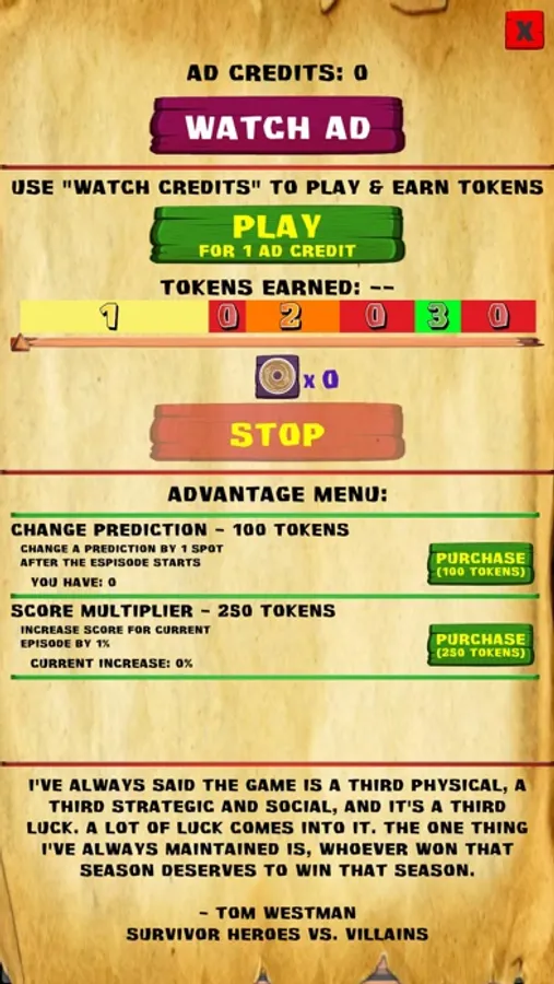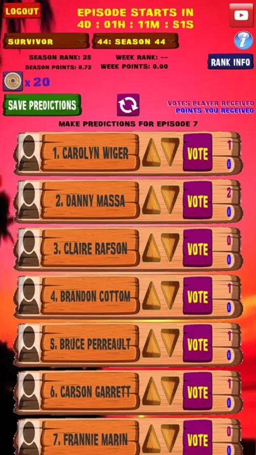 Disclosure: This is the first season for the app. If you find problems or have suggestions, please use the mail icon to send me feedback. More reality series and seasons will be added over time, but for the time being, Survivor Season 44 is the only one available.