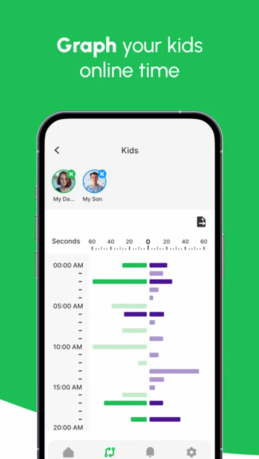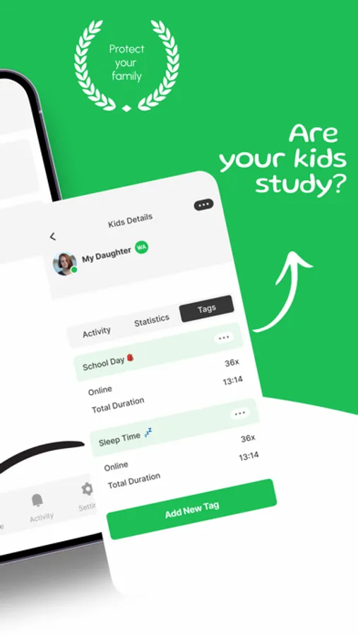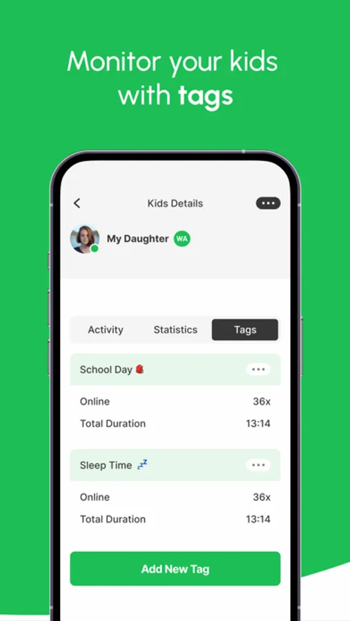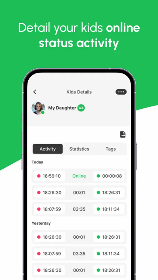 Our Statistics tab gives a graphical breakdown of activity data, while the Tags tab enables parents to group important periods for enhanced monitoring. For your convenience, you can download the CSV data directly to your phone.
