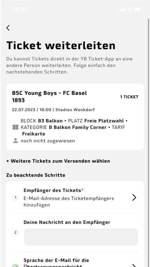 Die YB Ticket-App ist der sichere Ort für alle YB-Tickets und -Abonnemente. Fans erhalten ihre Tickets digital in die App geliefert und können sie mit einem Fingertipp aufrufen und ganz einfach an andere Personen weiterleiten.