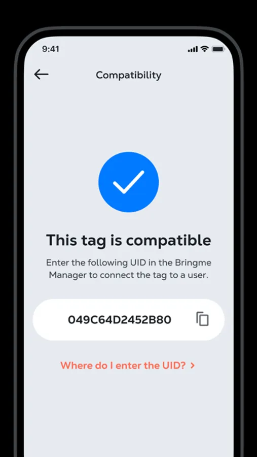 Scan any NFC tag and find out its UID and if it’s Bringme compatible.
