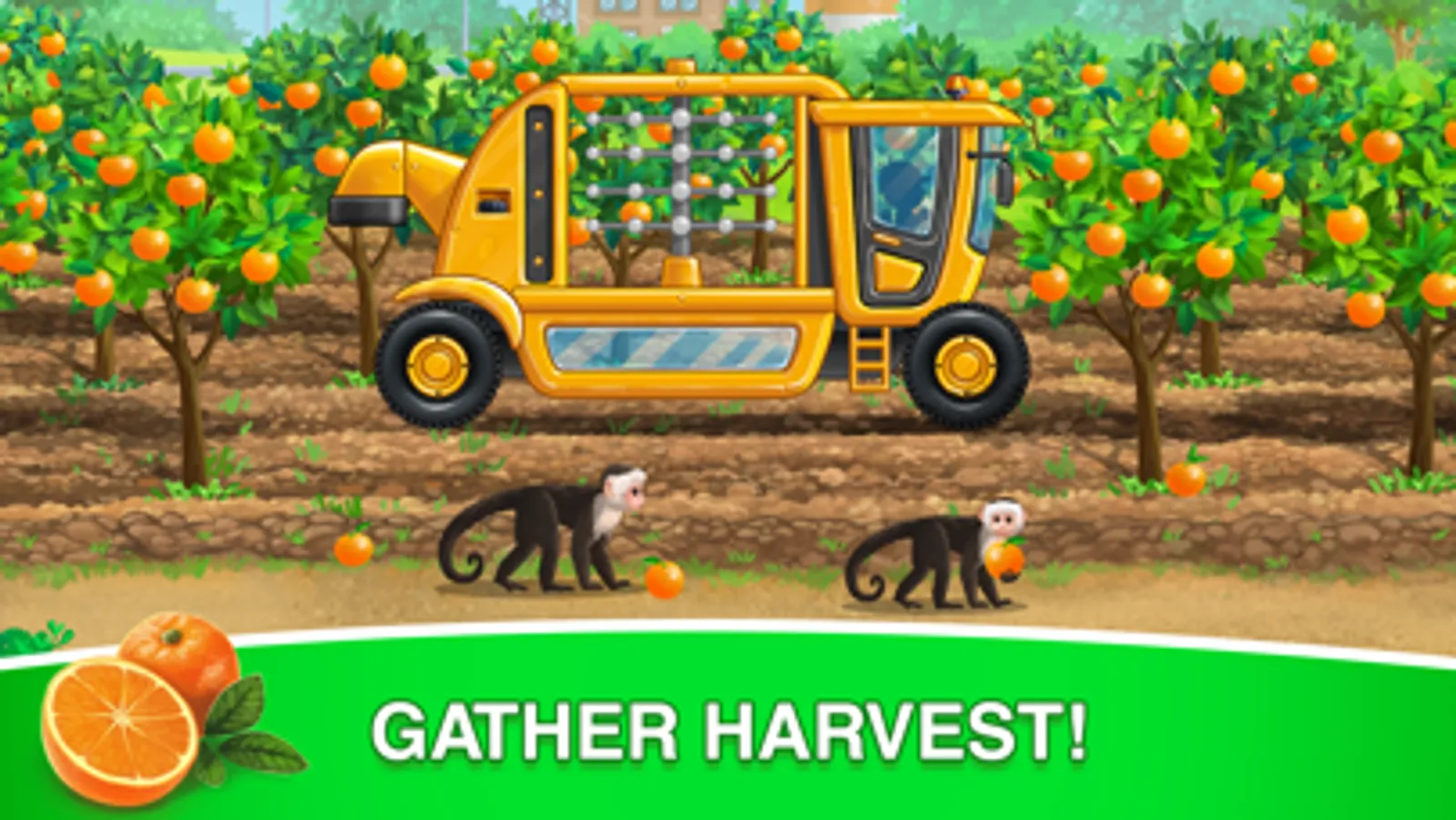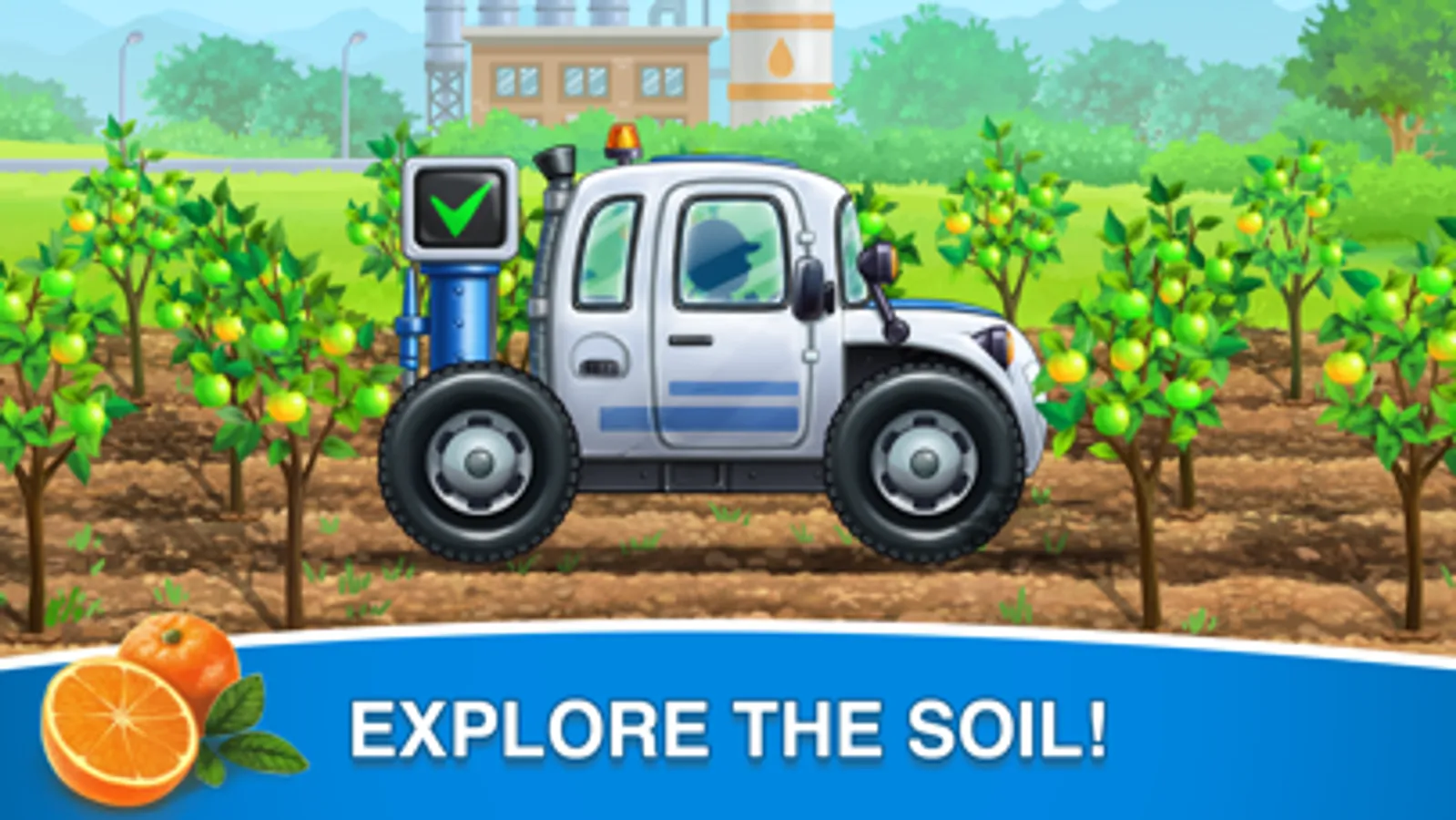 Funny educational games for children will catch your kids' attention and let them learn in a playful way! Kids build agricultural trucks and drive them around the farm. From 2 to 5 years old children will work on a farm simulator and care for orange trees! Kids put orange seeds into the soil, water them and watch them grow in real time!