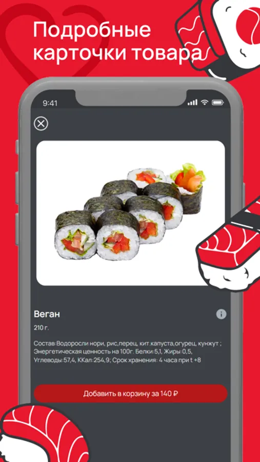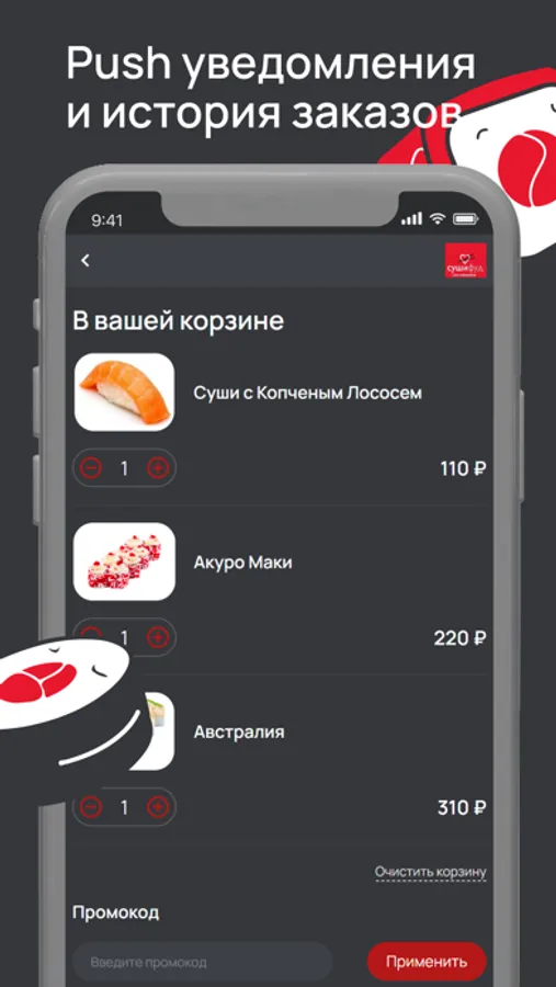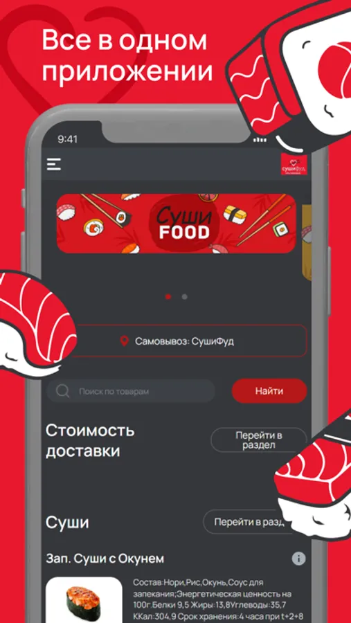 СушиФуд - это популярные магазины быстрого питания с доставкой на дом в более чем 35 городах России. Установите приложение "Суши Фуд". Делайте заказы быстро и удобно. Копите баллы и обплачивайте ими заказы. Рекомендуйте приложение друзьям, вступайте в наши группы и получайте ещё больше бонусов. Приложение "Суши Фуд" - это удобный интерфейс, актуальное меню, информация об акциях и конечно много подарков. Заказывайте любимые суши и роллы в один клик! Это быстро, удобно и очень вкусно!