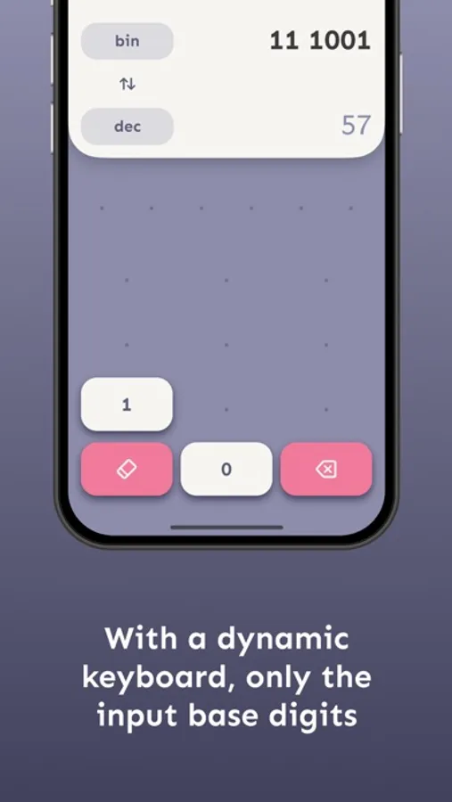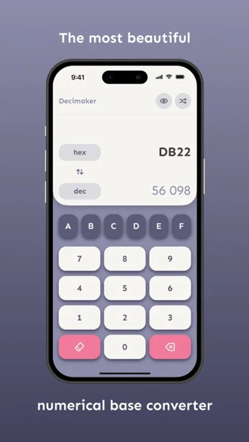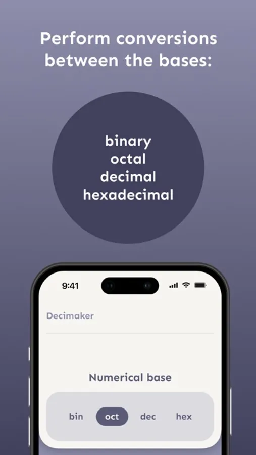 With Decimaker you will have the best user experience on performing numerical base conversions. With its intuitive interface, you can insert the digits from the dynamic keyboard accordingly to the numerical base input and choose between the binary, octal, decimal and hexadecimal bases with ease.
