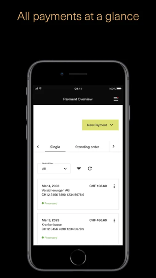 Enter new payments or standing orders and simply scan in QR-bills. This is where you also see pending or completed payments and their details.
