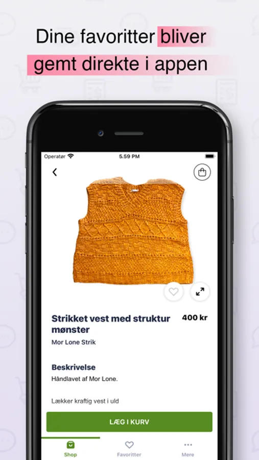 Har du fundet et produkt, du kan lide? Tilføj det til dine favoritter ved at trykke på hjerte-ikonet, så du ikke glemmer det. Dine favoritter bliver gemt direkte i appen. Når du er klar til at købe, kan du på få klik placere en ordre.