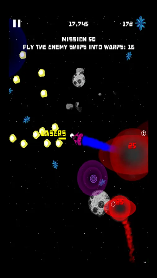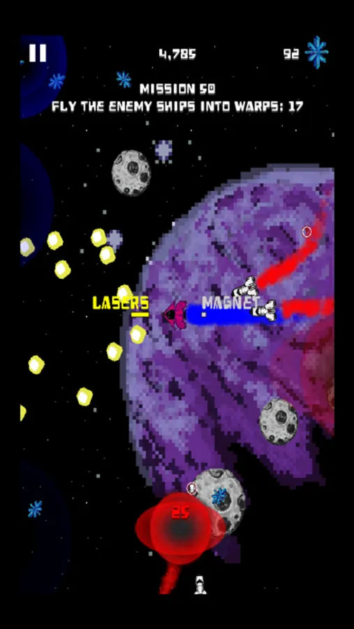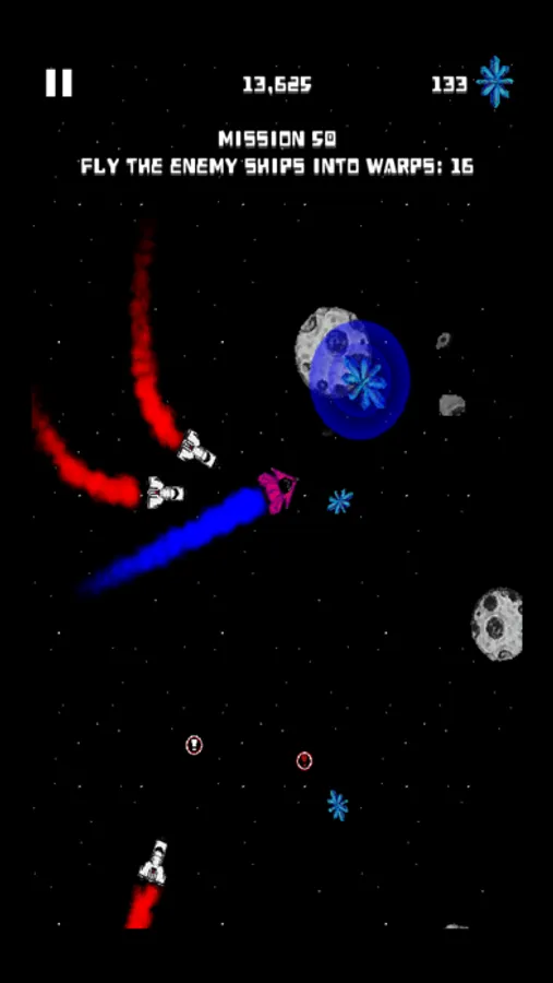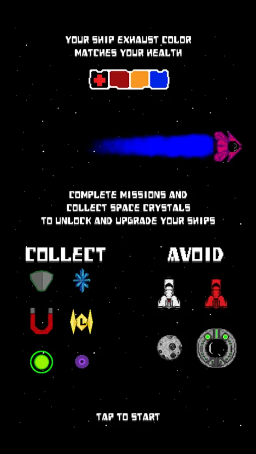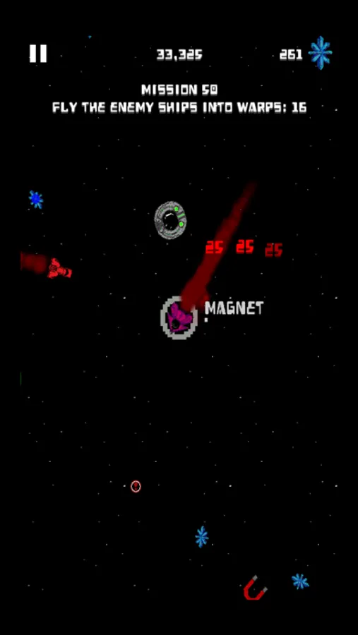 Collect crystals to upgrade your ships! Complete missions for extra crystals and to unlock more ships. Keep an eye out for the Command Ships - they drop lots of crystals when destroyed! Find power-ups to help destroy your pursuers and stay alive longer in this fast-paced, retro-arcade styled hyper casual game!