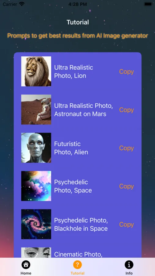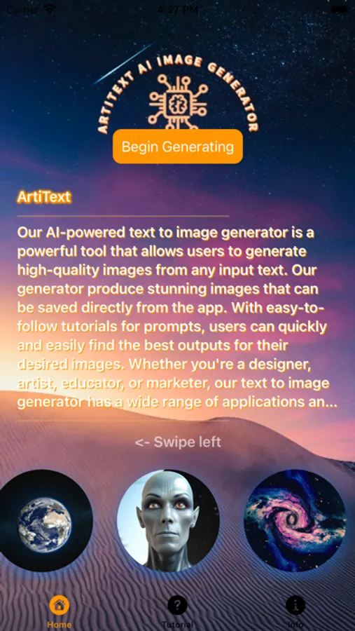 Transform your words into stunning visuals with our AI-powered text-to-image generator. Our app allows you to effortlessly create high-quality images from any input text. With intuitive prompts and easy-to-follow tutorials, even beginners can produce professional-grade designs in no time. Perfect for designers, artists, educators, and marketers, our app has a wide range of applications and potential uses. Customise your images through external apps or a phone built-in editor by saving the image, and take your creativity to the next level. Download now and discover the endless possibilities of our text-to-image generator!