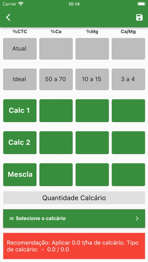 Com o aplicativo você interpreta e gera as recomendações com base em calcário dolomítico, calcítico ou mesclas destes, bem como estimar teores de óxido de cálcio e óxido de angésio finais, além das relações CalMg.