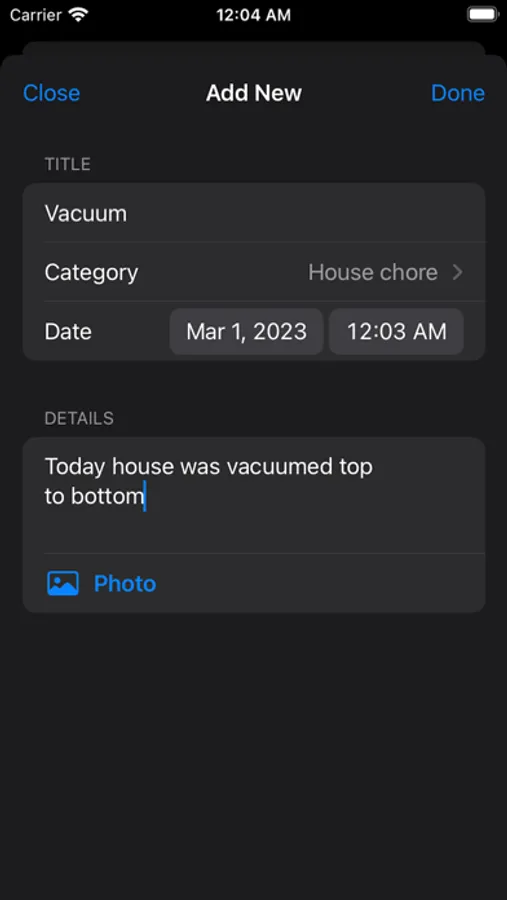 Middle tab with plus symbol allows to add new Last Time entry where a title and category are required. Date (pre-selected to today's date), details and a photo using phone's camera or chosen from Library, can be added to the entry. To upload a photo, tap the Photo button and a modal menu will be presented from where you can chose to pick a photo from local Library or access the camera to capture a new photo.