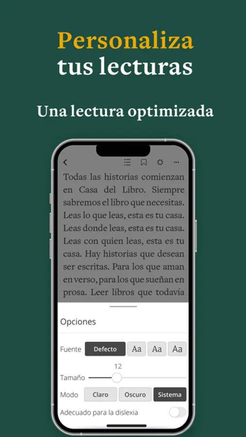 · Tus lecturas se adaptan a ti. Elige el tamaño del texto, el tipo de letra (tenemos una especialmente adecuada para la dislexia) y el color de fondo.
