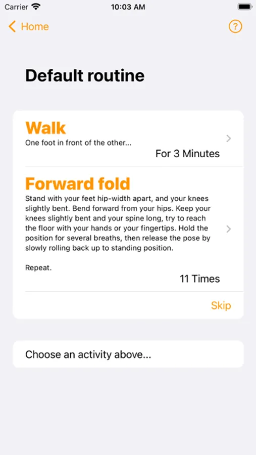 The free version of the app lets you choose among a wide selection of pre-defined activities. You also choose the duration of those activities—do you want the app to count repetitions or time them? For example, you may tell the app if you want to do jumping jacks 10 times or for one minute. To keep it more interesting, you can even set different ranges. For example, if you choose lunges as an activity, and you set the range to give you between 10 and 20 lunges, Get Moving might prompt you to do 12 lunges one time and 18 the next.