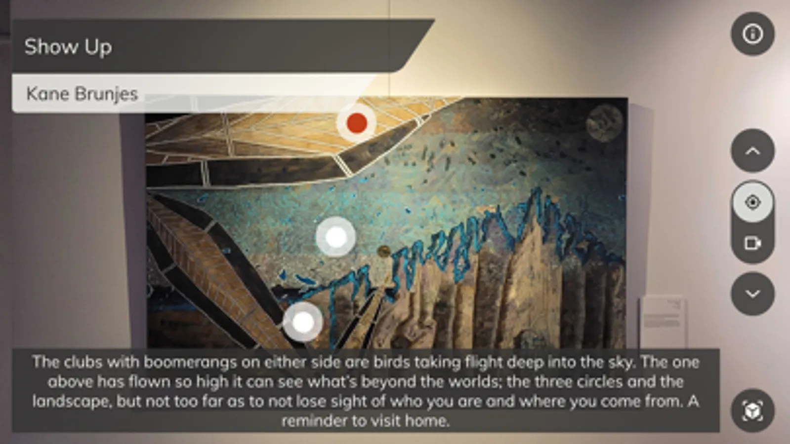 Using image recognition, visitors scan artworks, launching interactive experiences where artists narrate the history, culture, truth and story telling behind each artwork. The app provides points of interest to explain how the colours, shapes, and objects relate to and convey the stories.