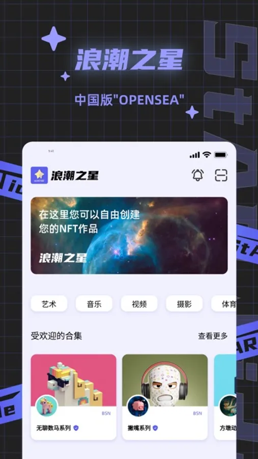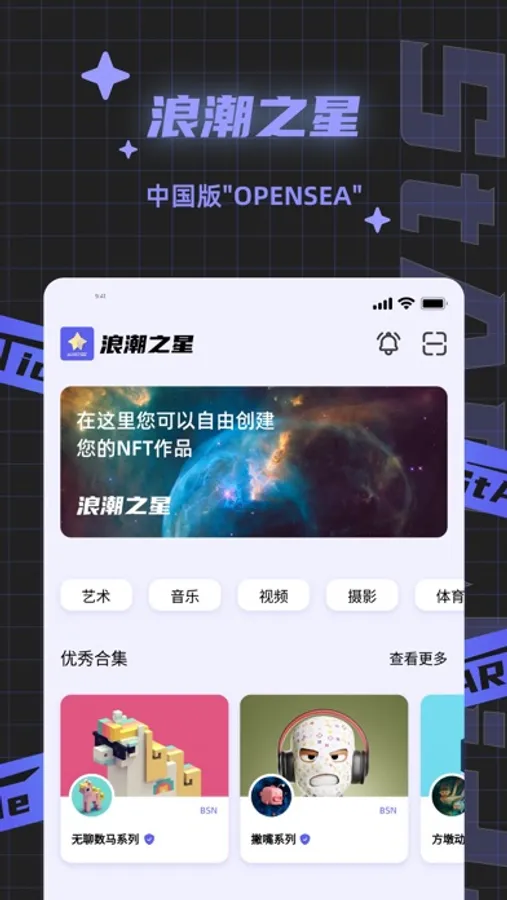 浪潮之星是基于区块链的艺术品数字化的应用。我们采用最多链的结构,让创作者可以在这里随时创建NFT数字商品,用于保护作品。