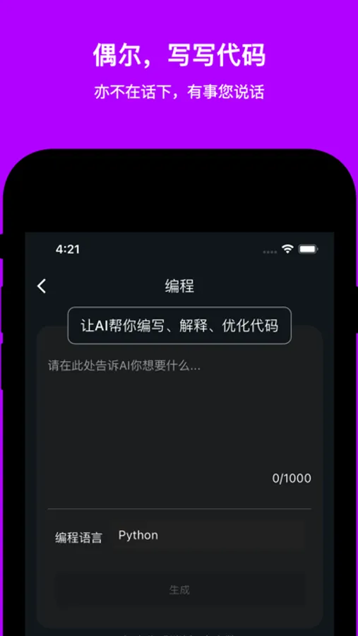 AI灵感工厂的最大特点是使用了先进的人工智能技术,能够快速响应用户的需要并生成高质量的建议和指导。该应用使用了最强AI引擎接口,实现了语音和文本对话,能够支持多种任务,包括但不限于代码编写、文案撰写、翻译、报告撰写、诗歌创作以及算法解决等方面。