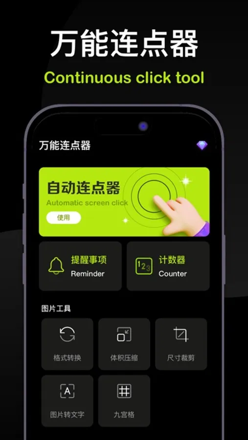 万能连点器是一款包含多种连点、提醒、计数的工具合集,特色功能: