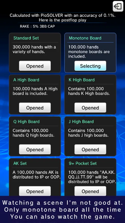 You can watch not only randomly, but you can also specify the board texture, such as "monotone board," or the hand, such as "AK is dealt.