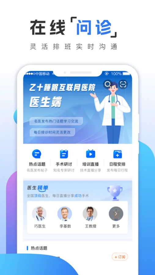 乙十睡眠医生端是基于乙十睡眠为医生打造的专业医疗服务工具,平台医生均来自知名医院,医生不仅可以通过本应用接诊服务,还可以和各地名医进行交流,发布学术观点,进行直播分享等。