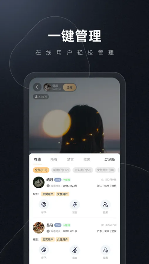 企业需求专属打造,切实多种解决行业问题,包括: 具有特色的抢购氛围,刺激粉丝下单、直播间一键管理用户,轻松成交、智能美颜,提高商品观摩质感、一键截屏记录抢拍用户,告别繁琐操作!