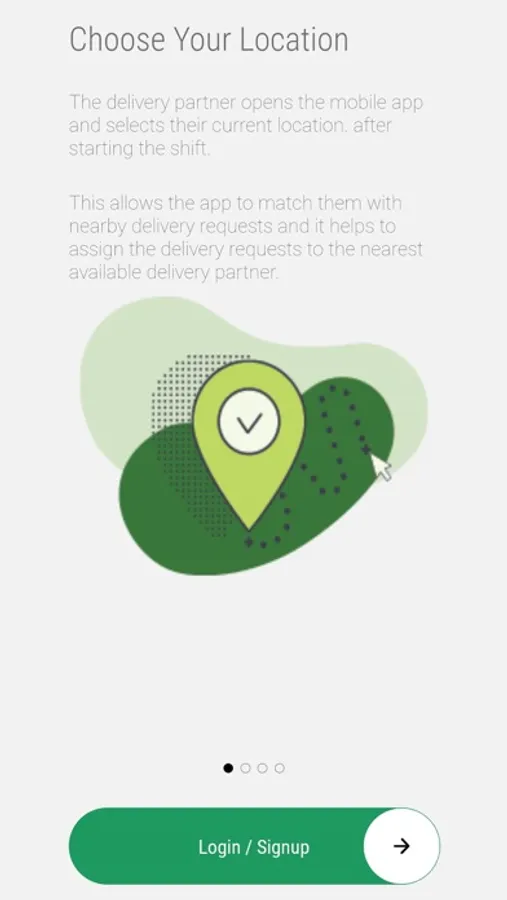 The delivery partner app provides a seamless experience for delivery partners. The first step is choosing their location. After starting their shift, the app matches them with nearby delivery requests, assigning orders to the nearest available partner. The app sends notifications for new delivery orders, which the partner can accept or decline based on their availability and preferences. They can also view order details, such as delivery address, customer name, and contact information.