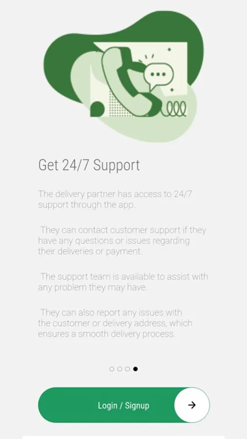 In case of any questions or issues, the delivery partner has access to 24/7 support through the app. They can contact customer support to report any problems with the customer or delivery address, ensuring a smooth delivery process. The support team is available to assist with any other problems the delivery partner may have regarding their deliveries or payment.