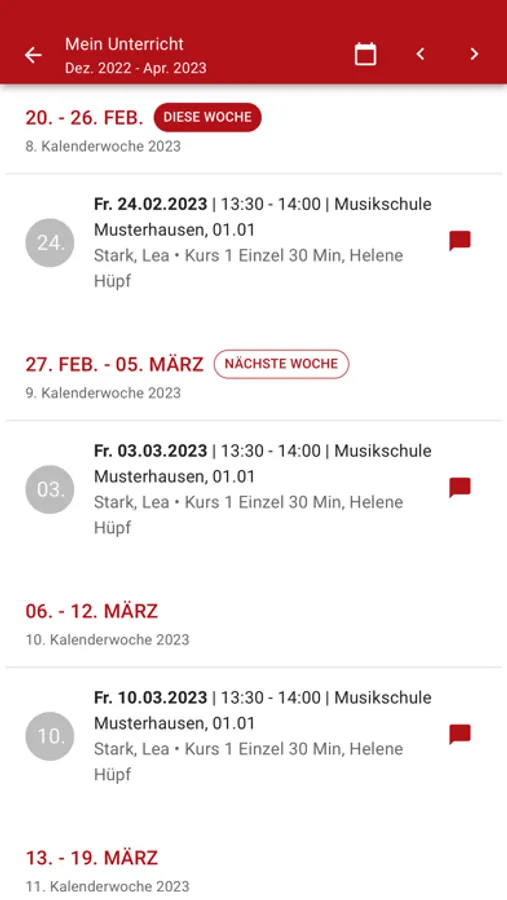 Die Übermittlung von Nachrichten zwischen Lehrkräften, Eltern, Schüler*innen und Musikschule erfolgt über eine App-interne ID und setzt keinerlei Kontaktinformationen voraus. Zum Chat und Nachrichtenaustausch sind somit keine E-Mail-Adressen oder Handynummern erforderlich.