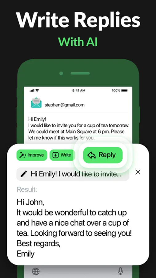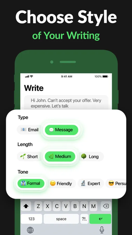 Navigating tricky communication scenarios won’t be a problem with Writely. By offering alternative wording options and suggesting ways to finish your sentences, the AI keyboard can assist you in effectively communicating your message, even in challenging situations. With Writely, you can express yourself more clearly and confidently. It’ll help you avoid misunderstandings and build stronger relationships with your colleagues, friends, and family. Whether you need to apologize, ask for help, or clarify something, the app will come to your rescue.