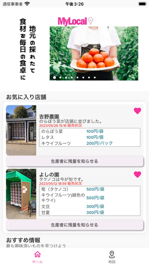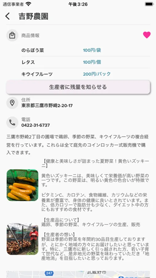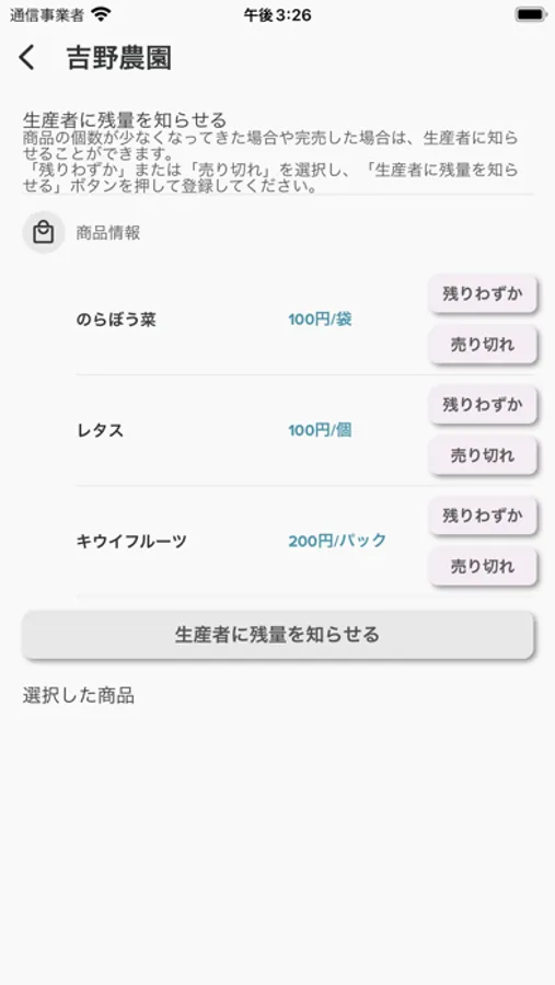 生産者が店頭に野菜や果物を並べたタイミングで商品情報をプッシュ通知することで、「どこで」「何が」「いくらで」「何個」販売されているかがリアルタイムに把握ができます!