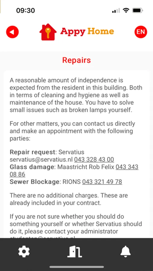 In the Appy Home app you will find all practical information about the facilities in and around the student building in which you live. If you want to quickly find the answer to your question, take a look at Appy Home! Via push messages, Servatius keeps you informed of various activities, malfunctions, settlement of service costs and much more. Be sure to turn on the push notifications option to stay informed of the latest news!