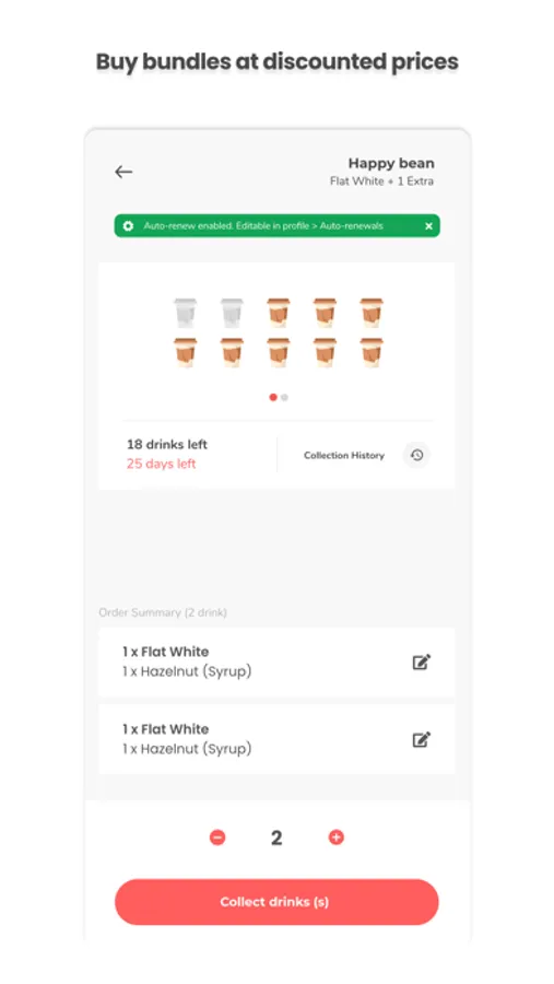 With Waycup, every drink counts. You get rewarded with financial savings by purchasing bundles of drinks that can then be redeemed within a specific time period (E.g. 30 days).