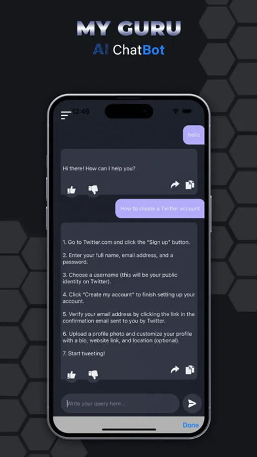 Introducing My Guru: AI ChatBot the ultimate personal assistant and AI chatbot. With My Guru, you can get instant help and answers to any question, anytime, anywhere. Simply type or speak your request and receive a quick and accurate response from our advanced artificial intelligence.