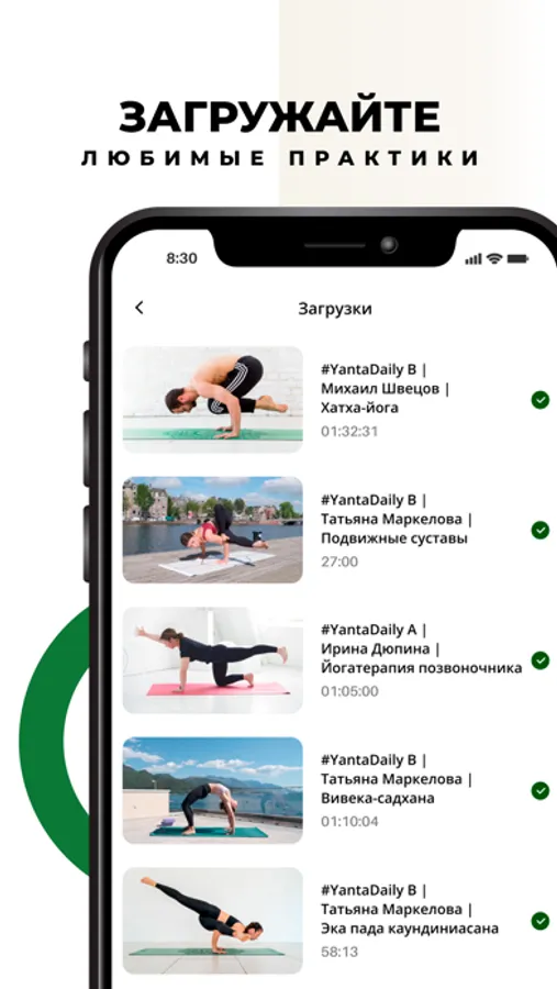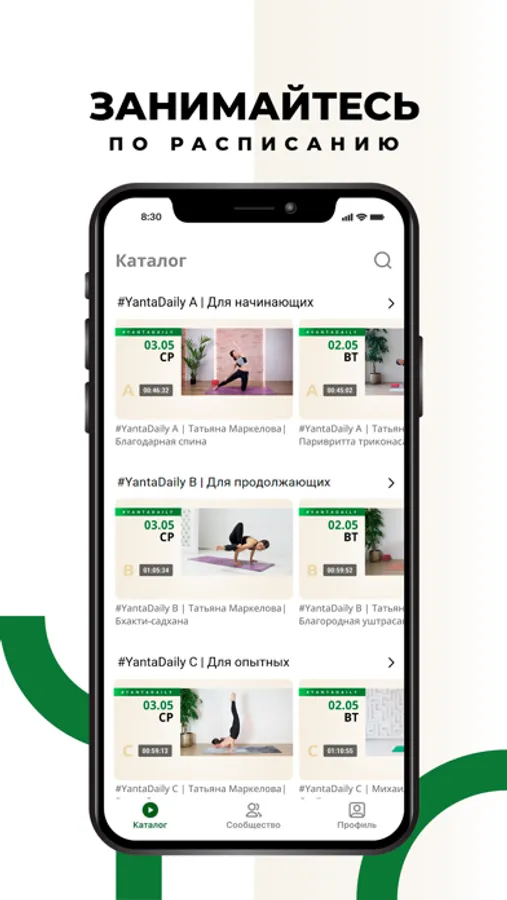 Вам не придётся тратить время на поиск подходящей практики: у вас всегда будет программа занятий на текущую неделю. В течение двух месяцев видеоуроки по расписанию не повторяются. Вы также можете заниматься в свободном режиме и выбирать любое занятие исходя из наличия свободного времени и других предпочтений.