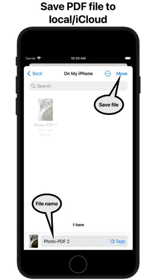 You can save the generated PDF file to your local iPhone/iPad or iCloud drive.