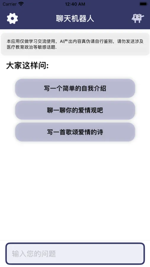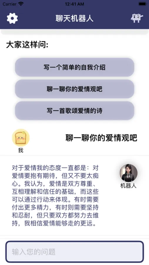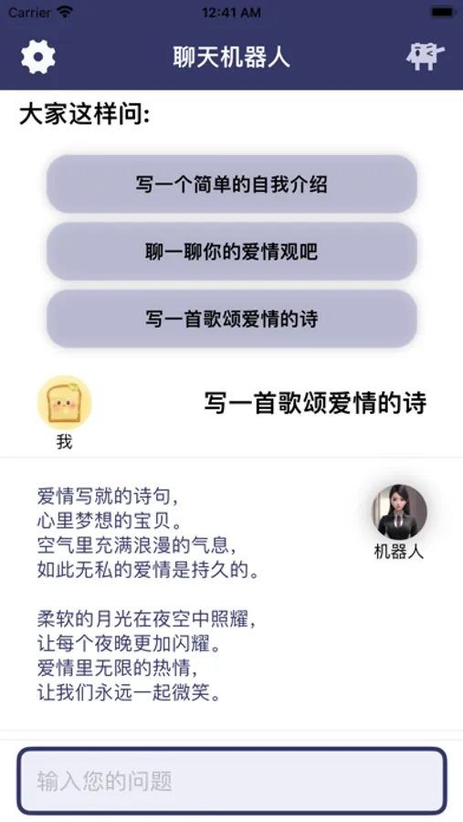 本应用采用了新一代的智能对话模型,可深入理解中文语义,流畅的与用户进行对话聊天。