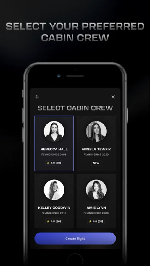 Users create and customize their profile settings and preferences, synched with an exclusive bookable XX-vetted cabin attendant roster, delivering superior hospitality tailored exactly to the users’ specific criteria.