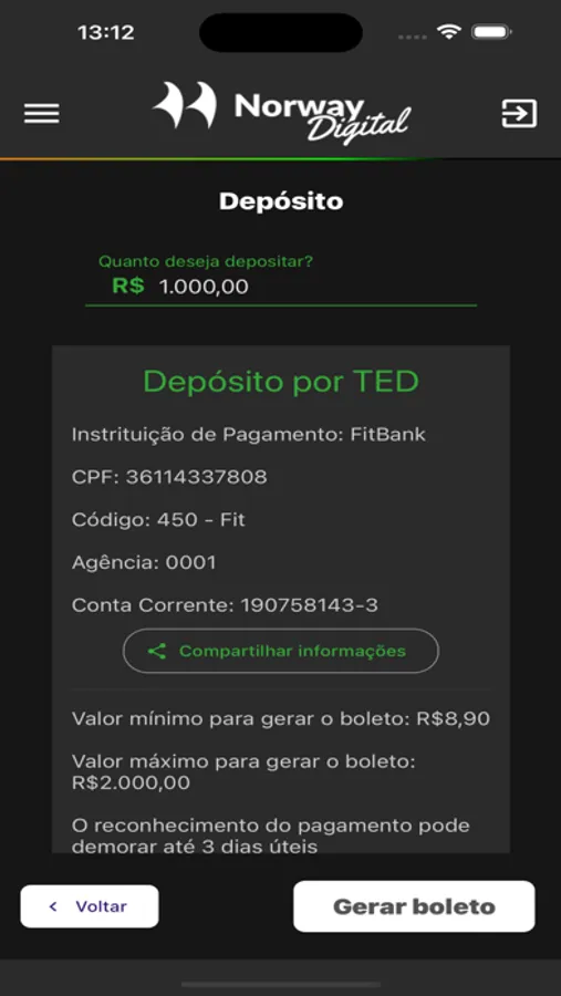 With our application, you can make instant transfers via PIX, as well as transfers via TED and DOC to accounts at other banks. In addition, you can also make deposits into your own account without having to go to a bank.