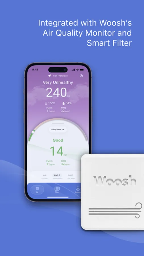 Setup your Woosh Smart Filter and Air Quality Monitor. Automatically protect your home's air quality by linking a compatible smart thermostat. View filter life plus indoor and outdoor air quality trends.