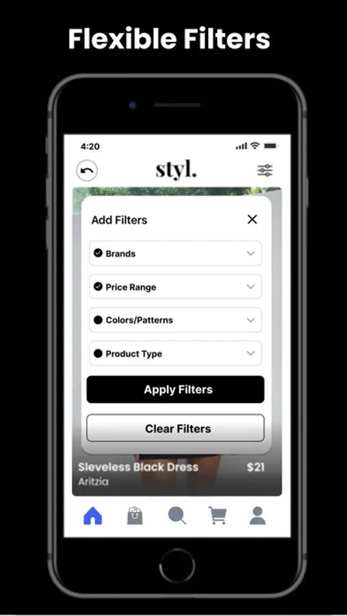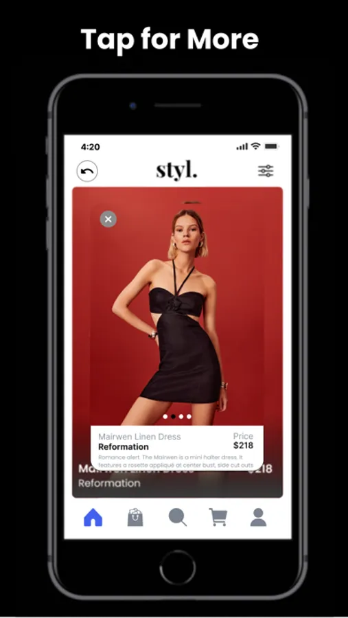 Filter by price, style, color, and brands to refine your recommendations. Simply tap on a product you like for more images, descriptions, and links. If you love it, swipe up to save it to your closet!