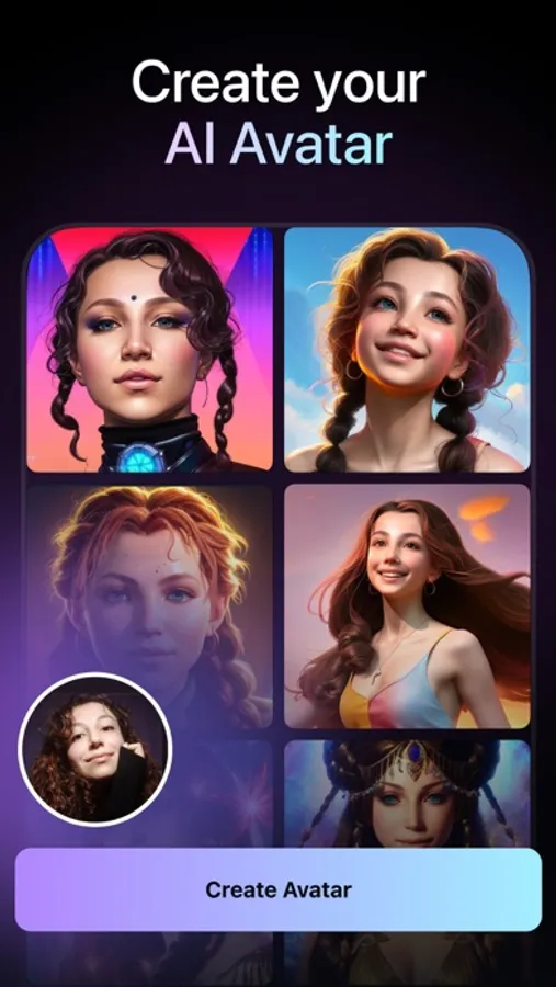 Take your selfies to the next level using AI Avatar feature. AI Avatar creates unique AI images based on your photos. See yourself as any character you can imagine with AI Avatar. AI Avatar can turn you into anime character, astronaut, princess, warrior, cartoon style superhero, a cool cyborg from the future, a 90s rock star, and more. Upload your photos to generate your AI portraits in various styles.