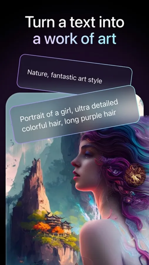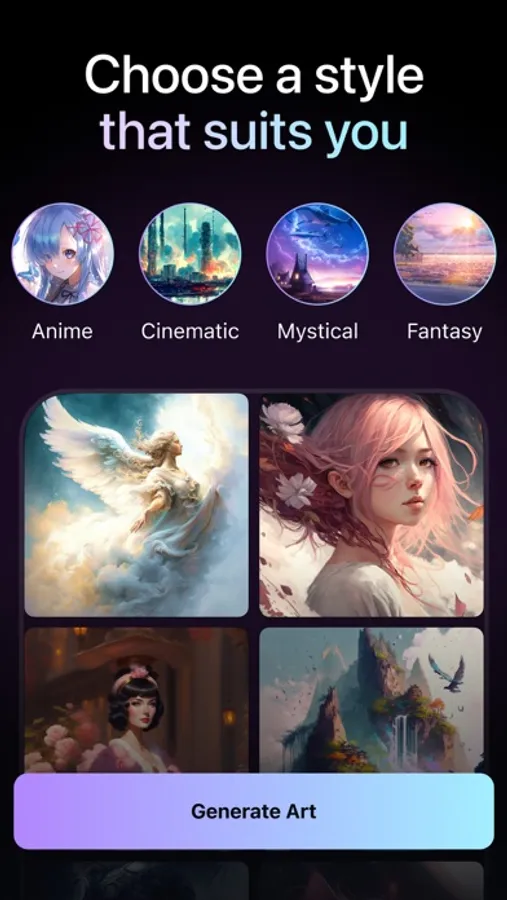 You can use AI Art Photo Generator styles such as: 3D, Fantasy, Anime, Acrylic, Black & white, Graphite, Japanese, Painting, Sketch, Photorealistic, Portrait and Watercolor. Become AI painter and design your own photos with AI Art Photo Generator. Whether you're looking to have fun or create a beautiful art, our AI art generator app will be there for you. Download AI Art Photo Generator today and discover a new world of creativity!