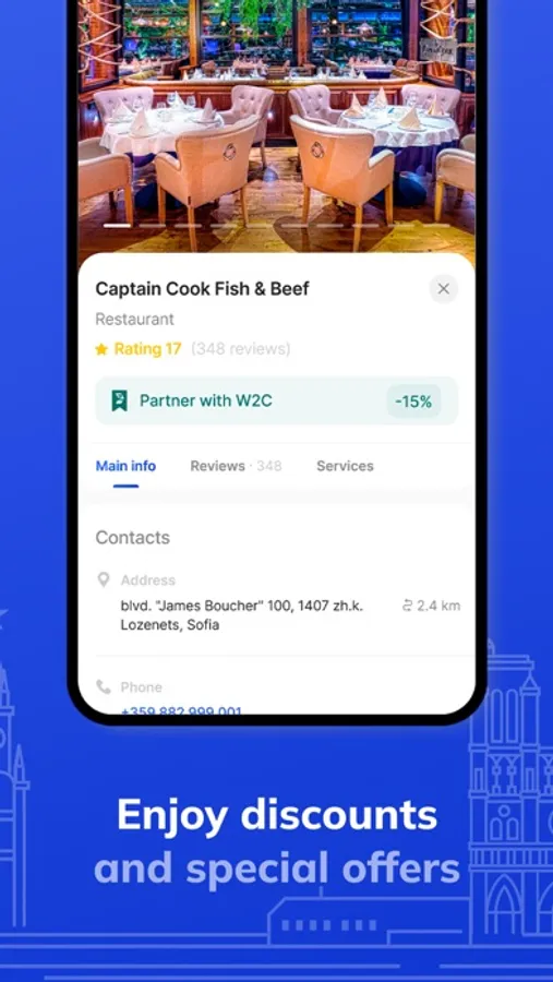 W2C (Welcome2City) is your ultimate guide to the best places and services in your city. Whether you're looking for a cozy restaurant, a luxurious spa, a trendy club or a comfortable hotel, we've got you covered. With our app, you can easily find, explore and book the most exciting experiences in town.