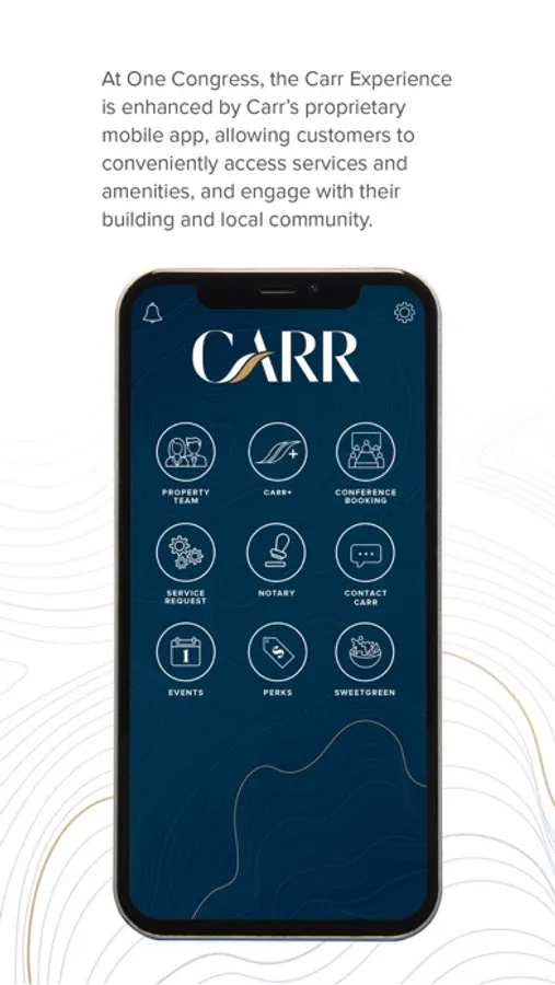 At One Congress, the Carr Experience is enhanced by our proprietary mobile app, allowing customers toconveniently access services and amenities, and stay connected with their property teamand building programming.