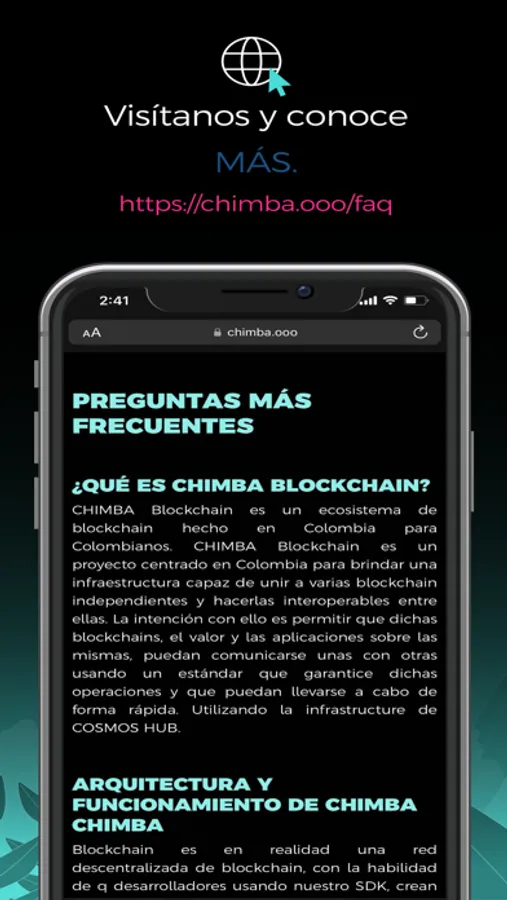- Nuestra misión es proporcionar valor y expandir el ecosistema de CHIMBA Blockchain a través no solo de nuestra billetera móvil, sino también de la operación del nodo CHIMBA validador, el CHIMBA explorador, la extensión Web y otros proyectos desarrollados por la comunidad.