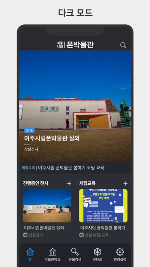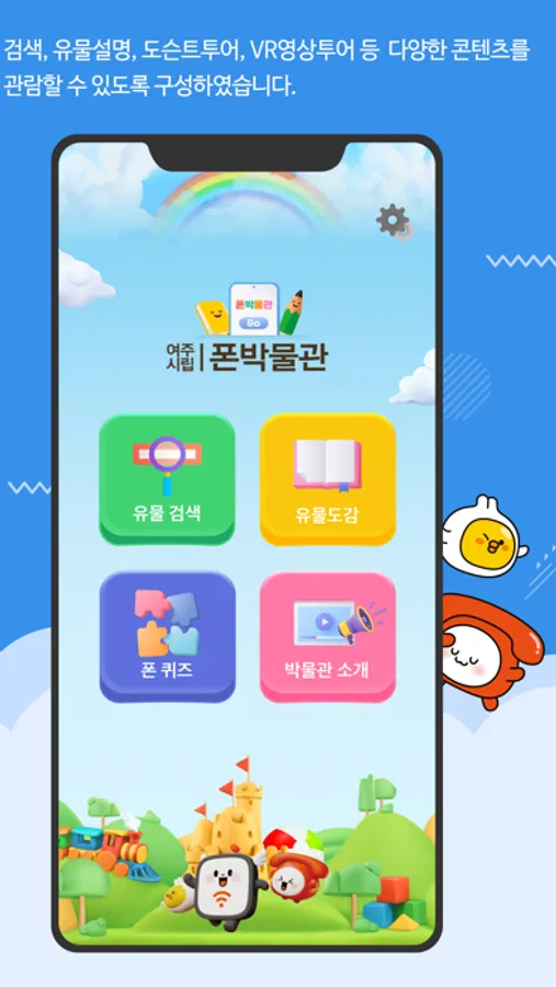 여주시립폰박물관 앱은 실내측위 기술을 이용하여 자동으로 전시 음성안내 서비스를 이용하실 수 있으며, 스마트폰 카메라로 촬영만 하면 간편하게 유물 검색이 가능합니다. 이밖에 증강현실(AR), 가상현실(VR) 등을 활용한 새로운 전시콘텐츠가 마련되어 있습니다. 어린이 모드에서는 직접 유물을 수집하는 유물도감, 폰OX/사지선다 퀴즈 등의 체험 서비스를 통해 쉽고 즐겁게 박물관을 관람할 수 있습니다.